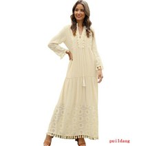 봄 여성 레이스 스티칭 타셀 슬러브 코튼 롱 드레스 비치 홀리데이 드레스